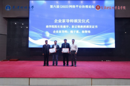 院长张建宇教授、组织创新与治理研究中心主任彭正银教授分别为魏子重副院长、杨智炜副总裁颁发企业家导师证书。