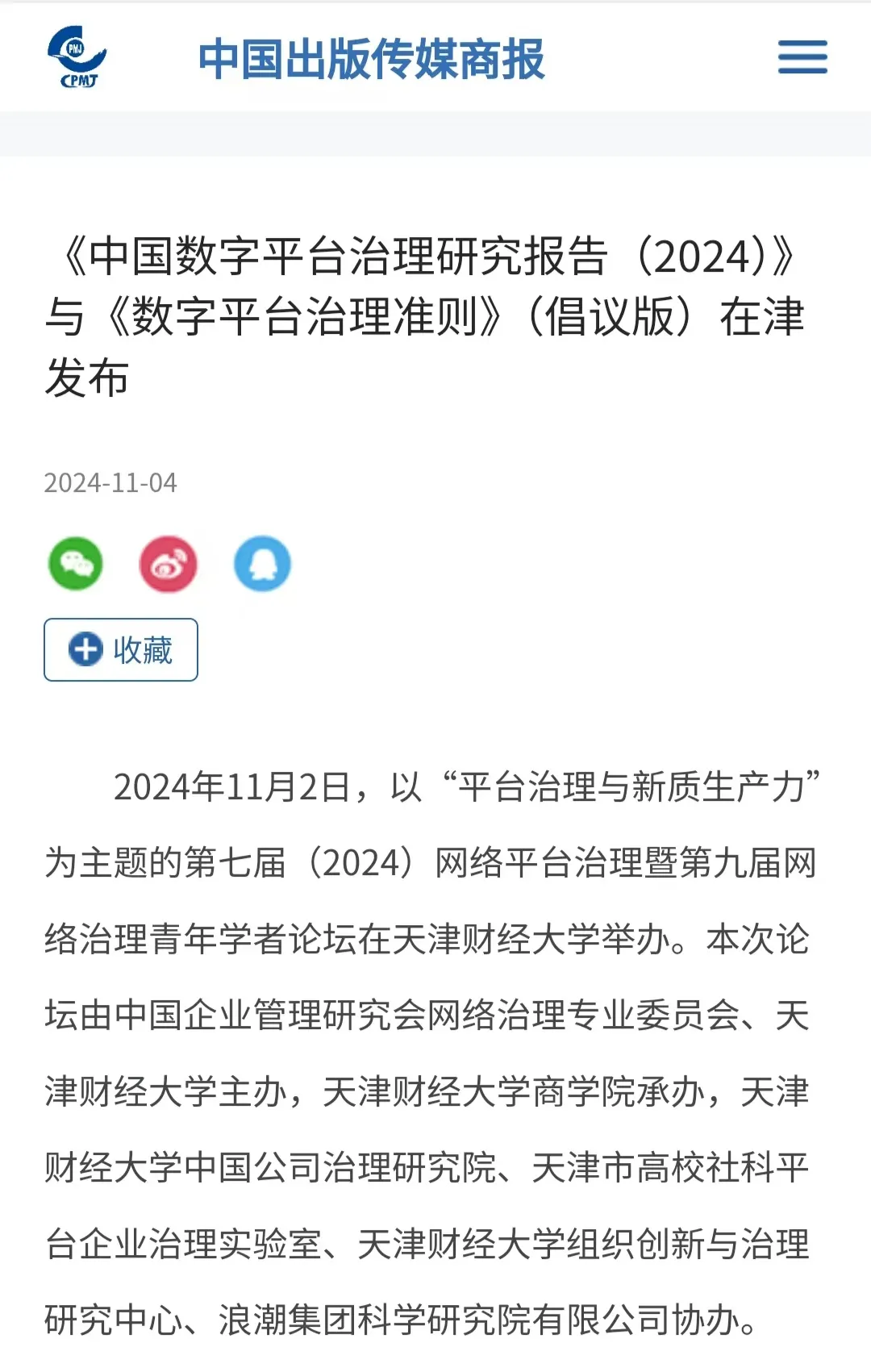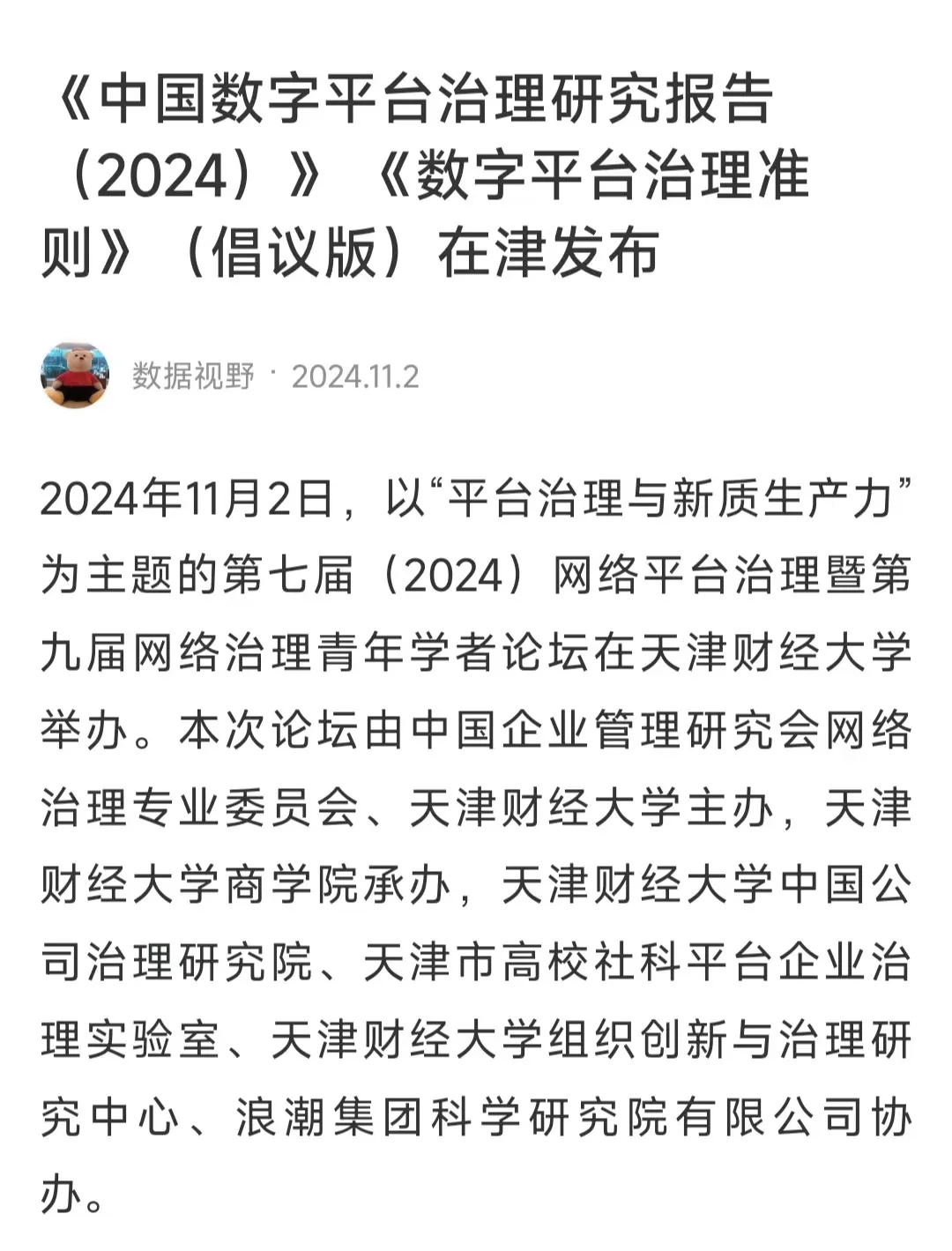 本次论坛深入探讨网络平台治理的最新进展、挑战与对策,为构建健康、有序、可持续的平台经济生态,推动经济高质量发展建言献策。中国经济新闻网、《金融时报》、《中国出版传媒商报》、天津频道、数据视野等多家媒体对此次活动进行报道!
