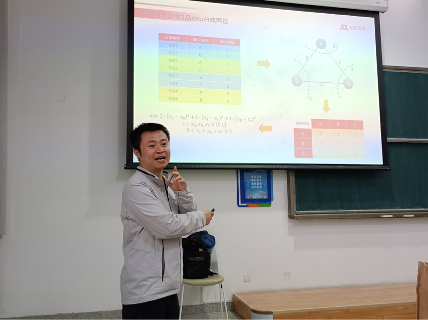 范博士为同学们讲解了算法、仿真、数据在无人仓中的具体应用,讲述了智能仓储中的选品、储存、拣选算法、基于“顺风车”模型的设备调度算法以及数据分析与挖掘在无人仓中的价值与应用。同时,他还分析了物流专业学生的未来职业规划。