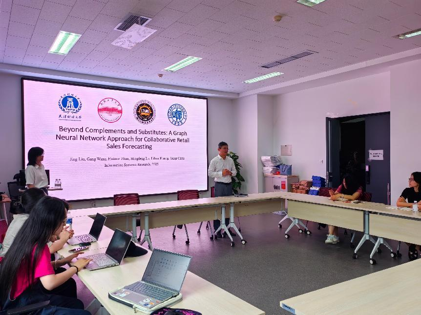 刘婧老师对计算机科学和社会科学的研究思维和范式的区别进行了介绍,并以其在UTD24期刊《Information System Research》发表成果“Beyond Complements and Substitutes:A Graph Neural Network Approach for Collaborative Retail Sales Forecasting”为例,详细分析并对比介绍了计算机科学和设计科学的研究关注点。针对数智化背景下的零售销量预测问题,刘婧老师对引入跨类别依赖理论对产品间复杂关系进行挖掘的原因、过程进行了详细介绍,并讲述了如何改进图神经网络方法以使其适用于探索零售销量预测的过程。