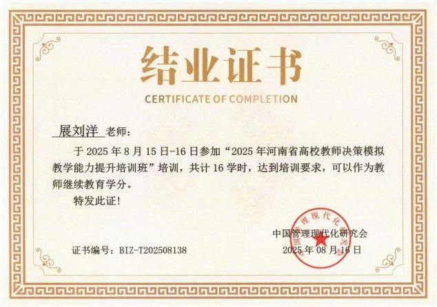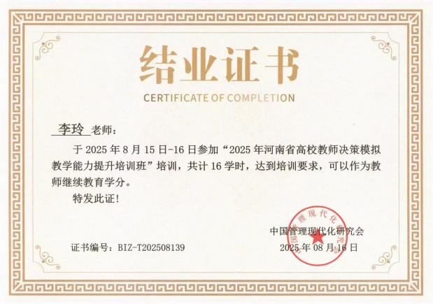 承办、北京金益博文科技有限公司提供技术支持的“2025年高校教师决策模拟教学能力提升培训班”顺利举办。我院教师展刘洋、李玲圆满完成决策模拟教学能力提升培训,双双荣获结业证书。