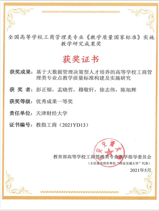一、基于大数据管理决策型人才培养的高等学校工商管理类专业点教学质量标准构建及实施研究,优秀成果一等奖