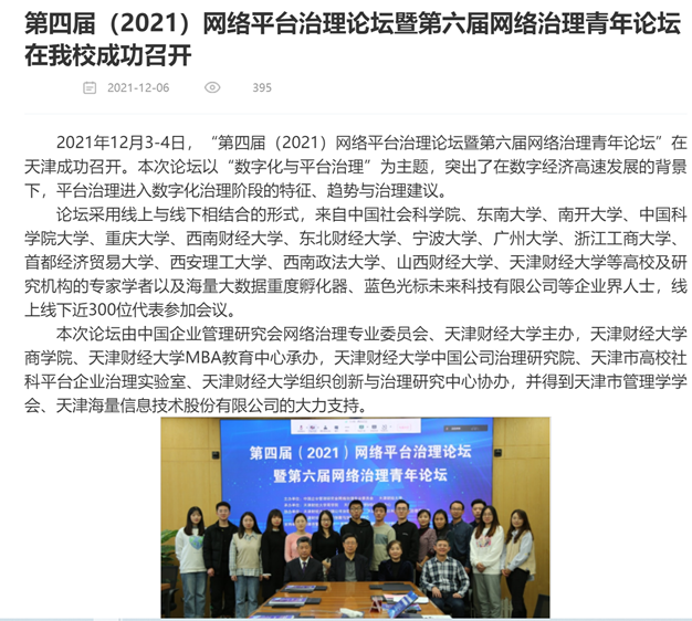 4.承办第四届(2021)网络平台治理论坛暨第六届网络治理青年论坛,并发布《中国数字平台治理研究报告(2021)》,多家媒体对此次论坛进行了报道;