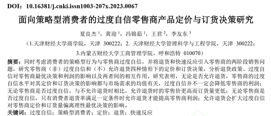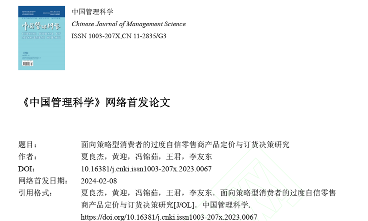 物流与供应链管理系夏良杰教授与硕士生黄迎和本科生冯锦茹共同完成的论文“面向策略型消费者的过度自信零售商产品定价与订货决策研究”在中文高水平期刊《中国管理科学》网络首发。