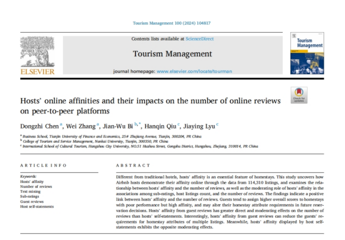 Dongzhi Chen , Wei Zhang , Jian-Wu Bi , Hanqin Qiu , Jiaying Lyu (2023). Hosts’ online affinities and their impacts on the number of online reviews on peer-to-peer platforms. Tourism Management, 100 (2024) 104817.