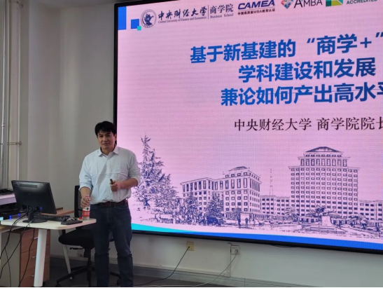 的学科建设情况,分享了在学科建设方面的做法和经验。他指出,基于新基建的国家战略,工商管理学科有必要整合不同学科的力量,探索“商科+”这一多学科的交叉领域,形成系列有潜力的新兴学科群。林院长提出了基于新基建的多个研究方向和研究路径,并详细介绍了如何产出高质量成果。