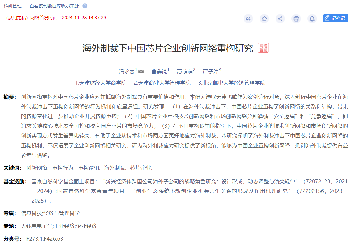 企业管理系冯永春副教授团队在国内高水平期刊《科研管理》网络首发学术论文“海外制裁下中国芯片企业创新网络重构研究”。