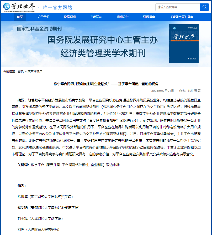 物流与供应链管理系刘玉斌教授团队在《管理世界》2025年第7期合作发表题为“数字平台跨界并购如何影响企业绩效?——基于平台间用户互动的视角”的学术论文。