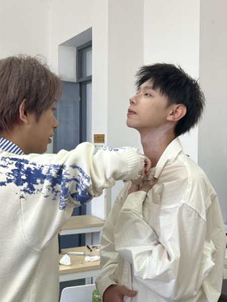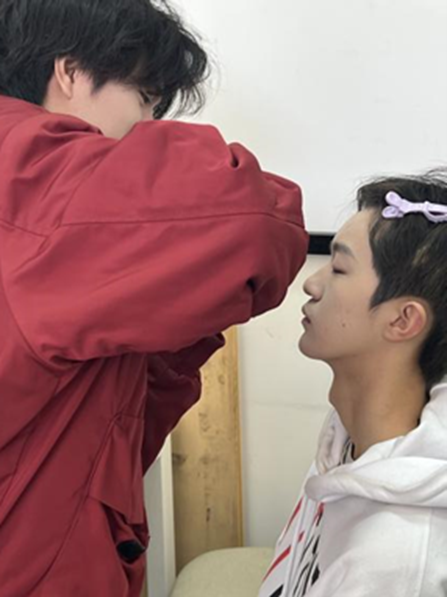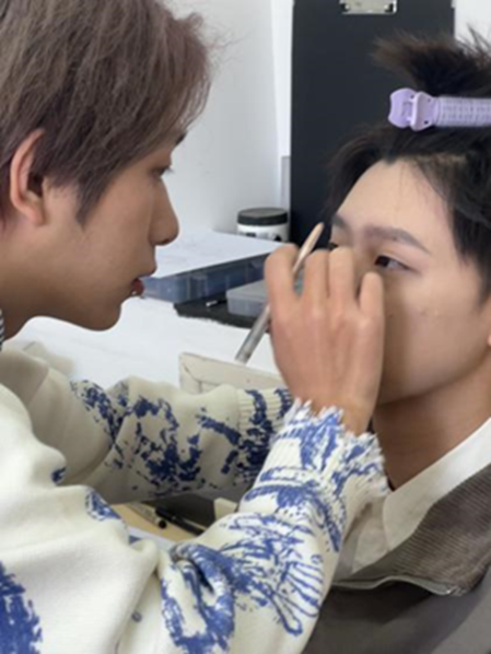 参赛当天,同学们在早上十点集合进行妆造设计,互帮互助完成妆容效果,展现大学生的良好风貌。